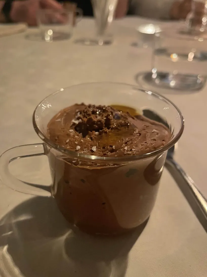 and a tasty chocolate dessert with a dash of olive oil and salt on top